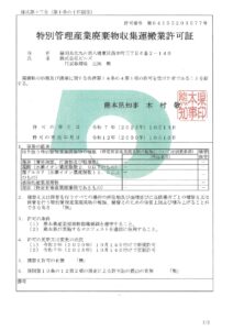 熊本県の特別管理産業廃棄物収集運搬業許可証が更新されました。