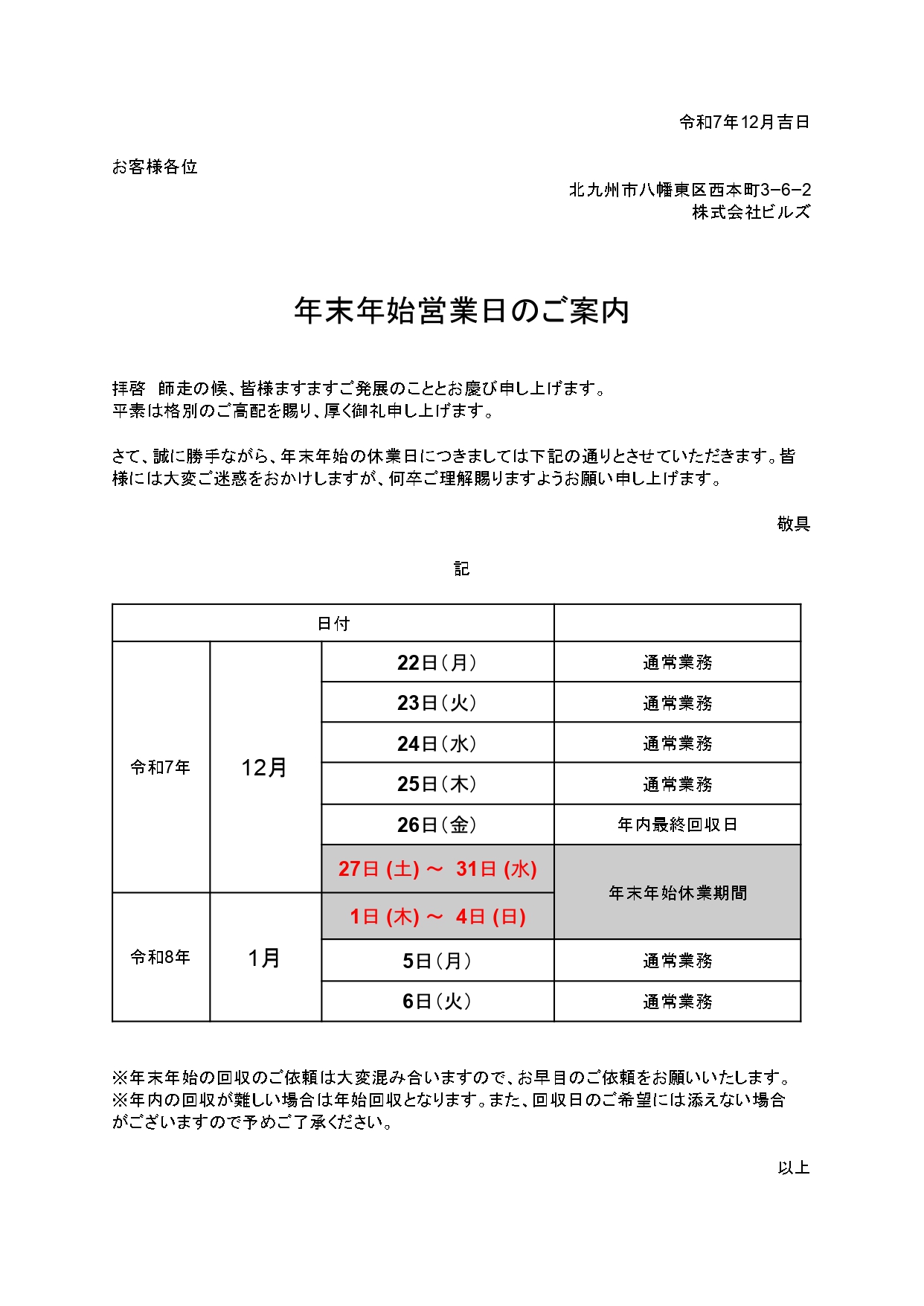 平素は格別のご高配を賜り、厚く御礼申し上げます。 さて、年末年始の休業日につきまして、誠に勝手ながら、下記の通りとさせていていただきます。 皆様には大変ご迷惑をおかけしますが、何卒ご容赦くださいますよう宜しくお願い申し上げます。